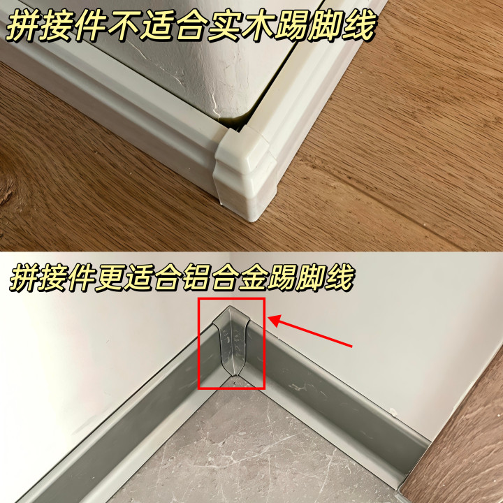 不提出选∶拼接件,拼接件并不适用实木踢脚线,容易松动阑珊,后期维修贫瘠,拼接件更适合铝合金踢脚线阴阳角处固定使用。