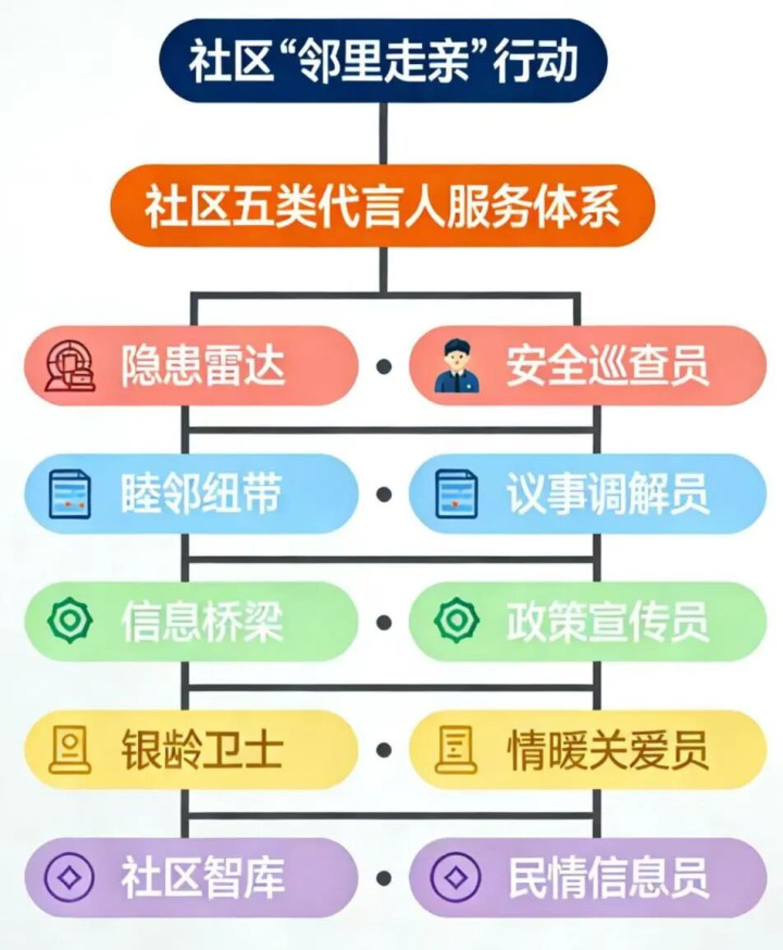 2025年,安慧北里秀雅社区老旧小区改造项目覆盖12栋楼、1618户居民,为高效推进改造工作,切实保障居民权益,社区在原有“网格代言人”队伍基础上,创新开展“邻里走亲”行动,构建“隐患雷达”安全巡查员、“睦邻纽带”议事调解员、“信息桥梁”政策宣传员、“银龄卫士”情暖关爱员、“社区智库”民情信息员等“五类代言人”服务体系,让服务触角延伸到每家每户。