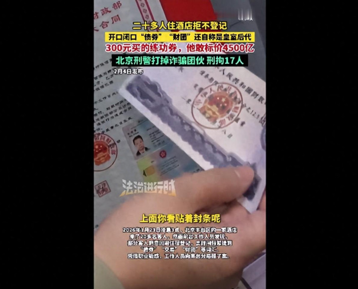 2026年1月23日凌晨3点,北京丰台区的一家酒店来了20多名客人。然而前台工作人员发现,部分客人刻意回避住宿登记,言辞间频繁提到“债券”“交易”“财团”等词汇。凭借职业敏感,工作人员向丰台分局报了案。当天,北京市公安局刑侦总队会同丰台分局等单位的侦查员在酒店,查获了31名涉案人员,以及虚假债券箱和大量练功券。随后,侦查员又在丰台区的另外一家宾馆抓获另外9名涉案人员。