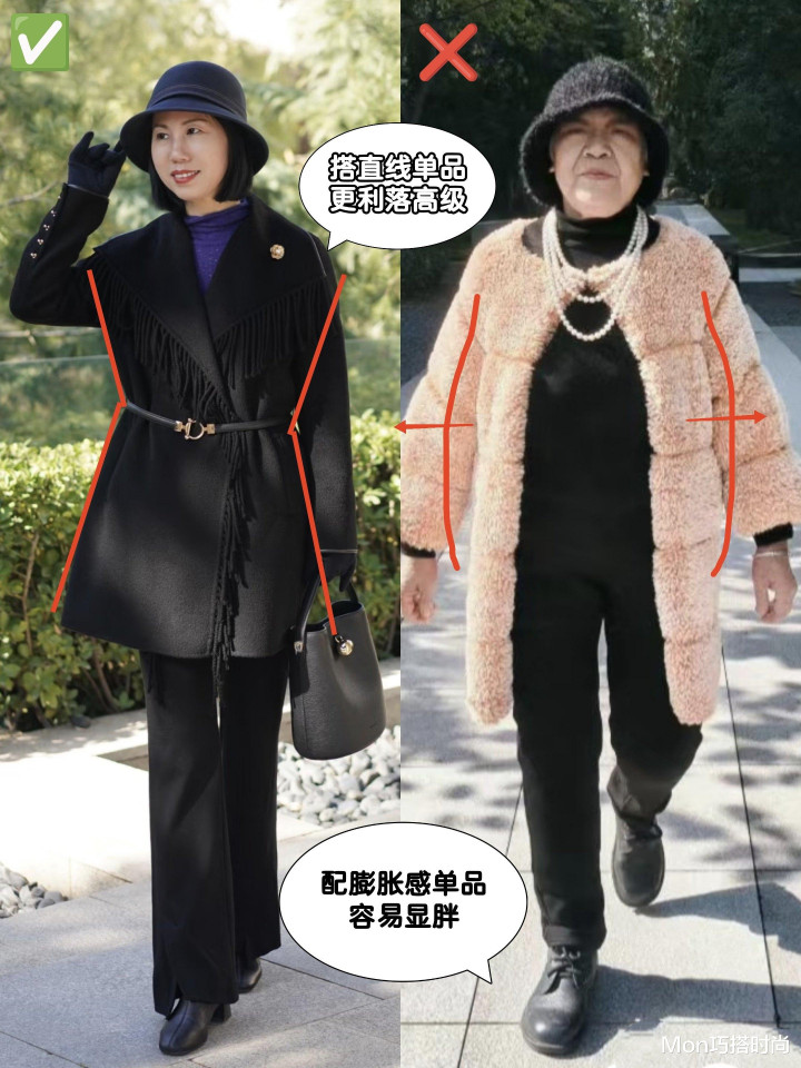 但是正因为钟形帽本身的线条太柔和了,我们如果搭配像皮草、羽绒服这种膨胀感很强或曲线条很多的衣服,上半身就会变得很臃肿。