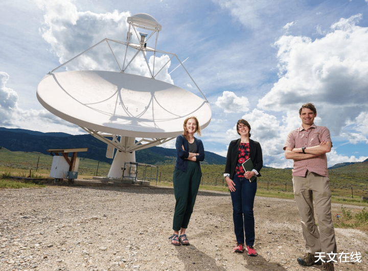从左至右顺序为征询东说念主员丽贝卡布斯、安娜奥尔说念格和亚历克斯希尔,他们站在用于网罗征询数据的千里镜旁。图片起原:加拿大国度征询委员会
