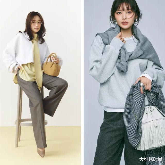 通过与浅灰色卫衣的叠穿,进一步突显蝴蝶结衬衫的立体感。加入黄色的渺小感,比单穿卫衣更显气色,营造出恰到克己的优雅印象。