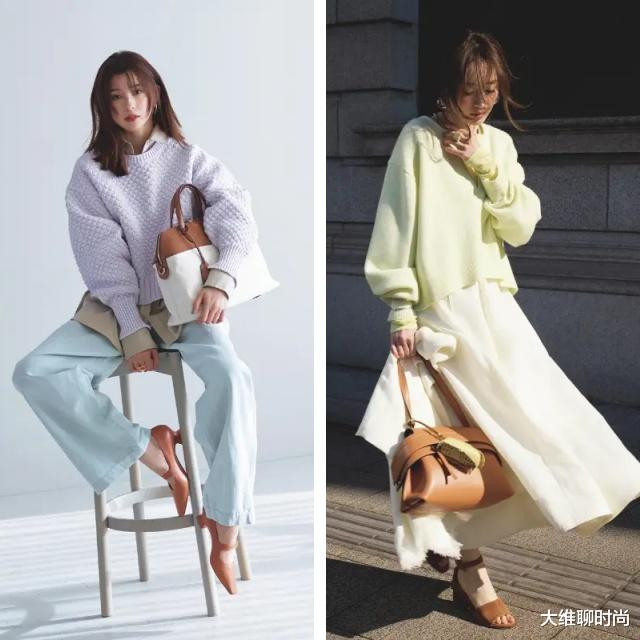 陡立有致的编织纹理赤诚衫。搭配带有牛仔质感的水蓝色裤子,穿搭更显简短。配饰以驼棕色收尾是要害。