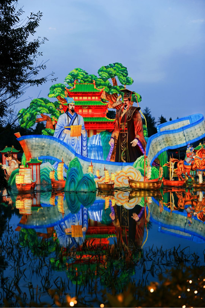 在宽敞灯组中,多个性情作品脱颖而出,成为全场焦点,彰显出文旅合伙的匠心巧想。其中,湖面“君臣之交”灯组规格创下积年之最,以45米长、45米宽、22米高的巨型体量轰动呈现,将三国君臣齐心的深有情感具象化,成为庙会中枢视觉地标。